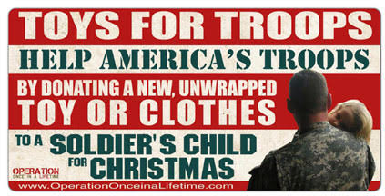 How can you help? Donate a new unwrapped toy at our various Toys For Troops drop off locations. To find the nearest location to you, please email contact@operationonceinalifetime.com or you can contribute directly to our Toys For Troops Drive on our Current Needs Page by clicking HERE.